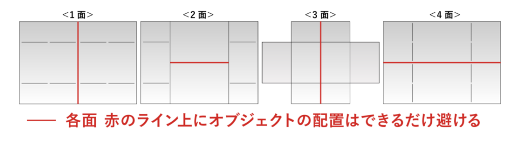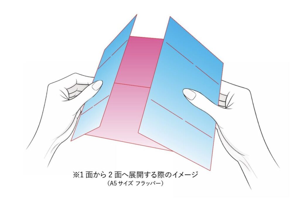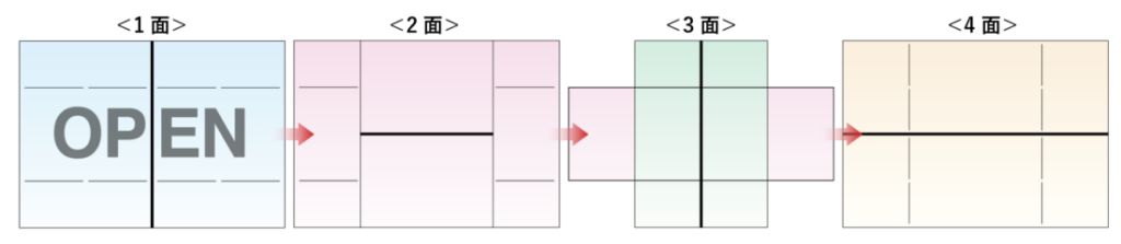 通常の名刺やチラシのように、同一の形状を4面並べる感覚とは少し異なります。